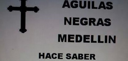 El panfleto se lo atribuyen las denominadas ‘Águilas Negras Medellín’. En el aseguran que debido a las constantes quejas de la ciudadanía declaran “objetivo militar y en lista de limpieza social a prepagos, gays, marihuaneros, proxenetas, atracadores y fleteros“.