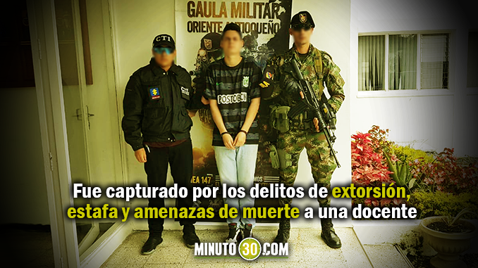 La Fiscalía, el CTI y el Gaula Oriente del Ejército hicieron efectiva la orden de captura a Mateo Restrepo Buitrago, de 21 años, por los delitos de extorsión, estafa y amenazas de muerte a una docente del municipio de Rionegro.
