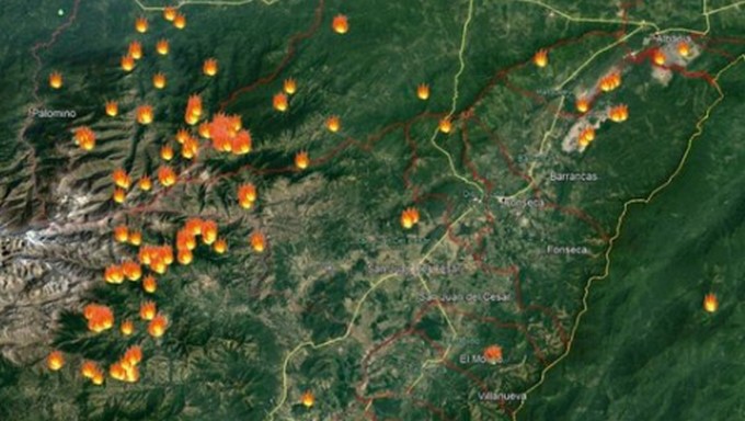 Luz Elvira Angarita, directora territorial de Parques dijo para varios medios de comunicación que el Ideam reportó 95 focos de calor en la Sierra Nevada que se suman a los 125 ubicadas por fuera del área protegida.