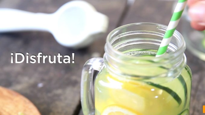 Para prepar esta ‘agua detox’ necesitas 2 limones verdes, uno de ellos para exprimirlo, 1 limón amarillo, pepino y agua. Luego de cortar en pequeñas rodajas los ingredientes, exprimes el limón que tenías dispuesto para ello y agregas dos tazas de agua.