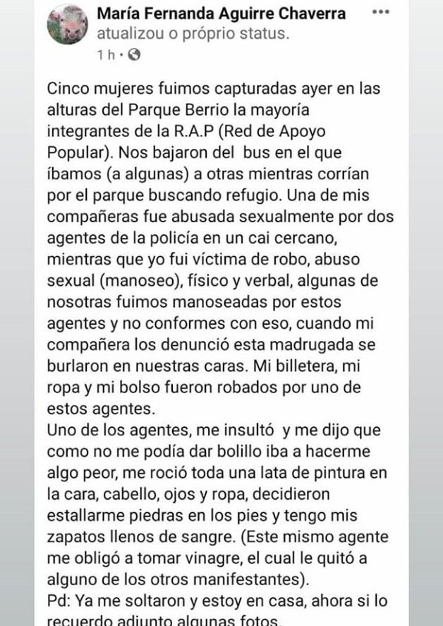 A pesar de ello, horas después una de las manifestantes, ya en su casa, expresó en su cuenta de Facebook que había sido víctima de abuso sexual y que una de sus compañeras había sido violada sexualmente por parte de dos agentes de la policía en un CAI cercano. La denunciante dijo además que le estallaron piedras en los pies y que “tenía los zapatos llenos de sangre”.