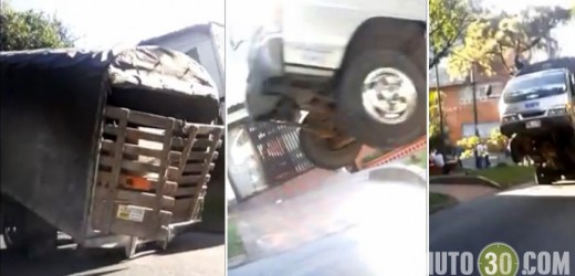 Minuto30.com .- Un curiosos hecho se registró la tarde de este martes en el barrio Alcalá de Envigado, cuando un camión, al parecer por el peso quedó suspendido en el aire. Según Reporte Ciudadano llegado hasta Minuto30.com, el camión subía por una pendiente cuando quedó parado en las llantas traseras.