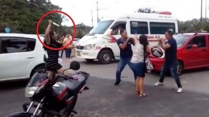 Ese acto desató los golpes entre los dos hombre, y al ver que su acompañante estaba siendo golpeado, la mujer se bajó del carro con cuchillo en mano e intentó apuñalar a los presentes.