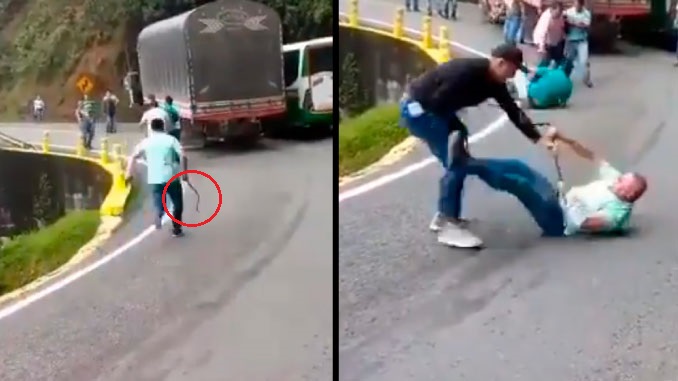 #TOLIMA. Con machete y varillas se enfrentaron conductores de vehículos pesado en vía que comunica Manizales con Bogotá, sector Alto de Minas. La pelea se originó cuando el conductor de camión intentó adelantar un bus repleto de pasajeros en peligrosa curva originando el choque. pic.twitter.com/rQxCKYtf0A