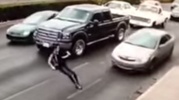 EN VIDEO: Cruzó corriendo en tacones y terminó bajo las llantas de un carro