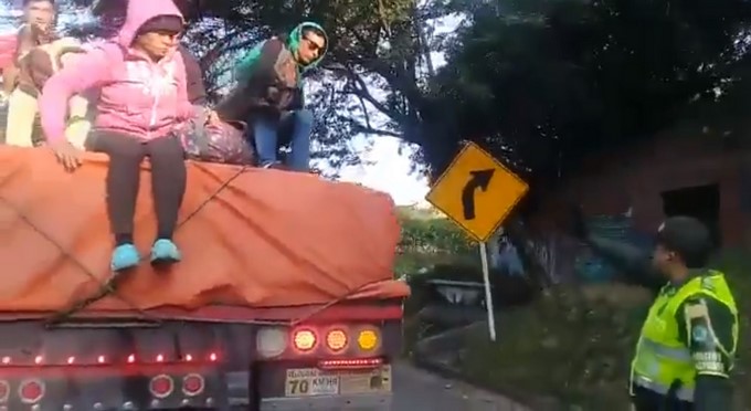 La Policía Nacional publicó un caso de cuatro personas que se movilizaban como ‘polizones’ sobre una tractomula en la vía entre Piedecuesta y Floridablanca.