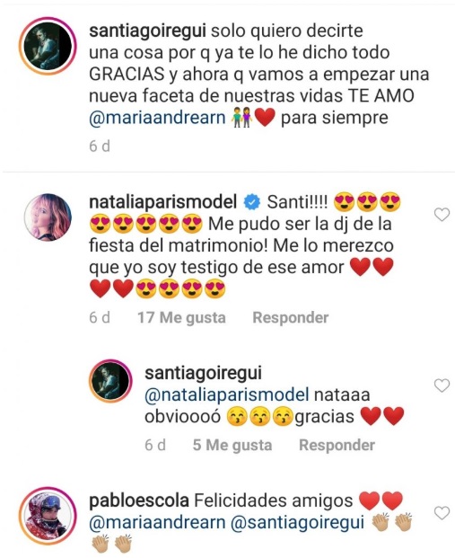En medio de la canción ‘Domingo’ de Reykon de fondo, Santiago se puso de rodillas y saco una ‘cajita’ de color rojo en el que tenía el anillo con el que le pediría a María Andrea que comparta la vida con él. Fueron varios los comentarios en que lo felicitaban, pero el que se destaca el de Natalia Paris, quien pidió ser la Dj de la fiesta de matrimonio.
