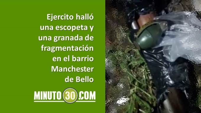 Minuto30.com .- El Batallón de Ingenieros No. 4 General Pedro Nel Ospina, durante una operación militar de control territorial, logró la ubicación y posterior incautación de un arma larga tipo escopeta y una granada de fragmentación en el barrio Manchester del municipio de Bello, norte del Valle de Aburrá.