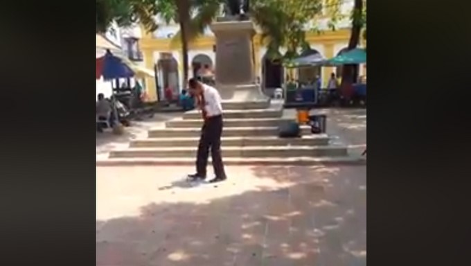 El hombre que se encuentra en una plaza pública del municipio de Mompox grita con el martillo en la mano que rechaza que la comunidad católica ha puesto “su confianza en los ídolos que no tienen vida” mientras destruye la figura.