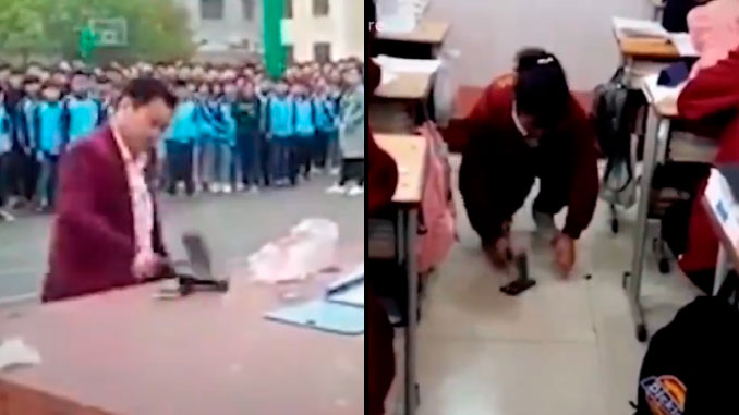 Los niños en China se ven obligados a destruir sus teléfonos móviles delante de sus compañeros por una adicción que les desconcentra en el estudio. ¿Qué les parece este método? pic.twitter.com/TRhItc0qFF
