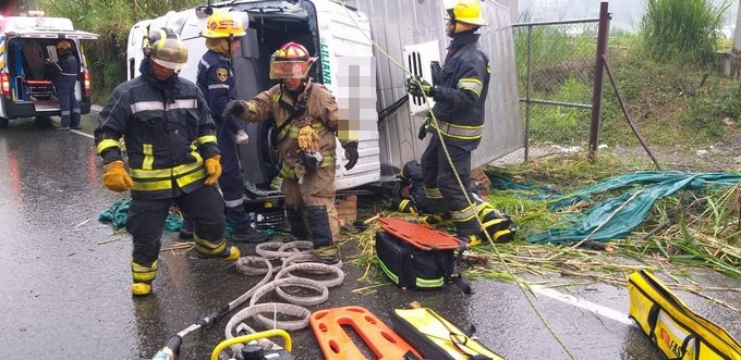 En video quedó registrada la ágil acción que llevaron a cabo un grupo de bomberos del sur del Valle de Aburrá para rescatar a dos hombres que quedaron atrapados a bordo de un camión que se volcó.