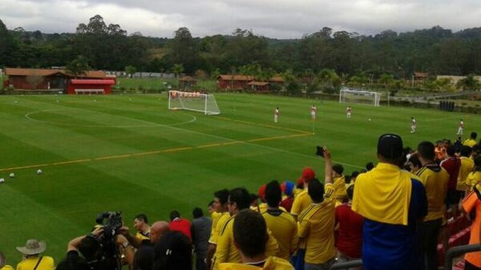 Minuto30.com.- El pasado lunes en el entrenamiento de La Selección Colombia en canchas brasileras, se vivió un bochornoso espectáculo protagonizado por hinchas de la tricolor, uno de los seguidores ataca con cuchillo a otro aficionado que se encuentra en la tribuna.