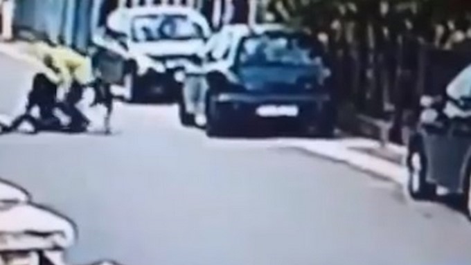 Por medio de las cámaras de seguridad del sector quedó grabado el preciso momento en que el animal se le tiró al sujeto por detrás.