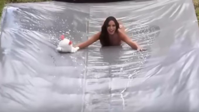 Y es que la joven se debía lanzar, llevando consigo un osito de peluche, por una rampa repleta de jabón que al final llegaba a una piscina, en el trayecto cualquier cosa podría pasar… menos soltar “el peluche”.