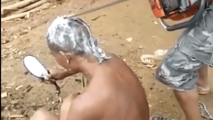 Lo que llama la situación en este caso es que el “estilista” está usando una motosierra, mientras que su amigo muy campante se mira en el espejo.