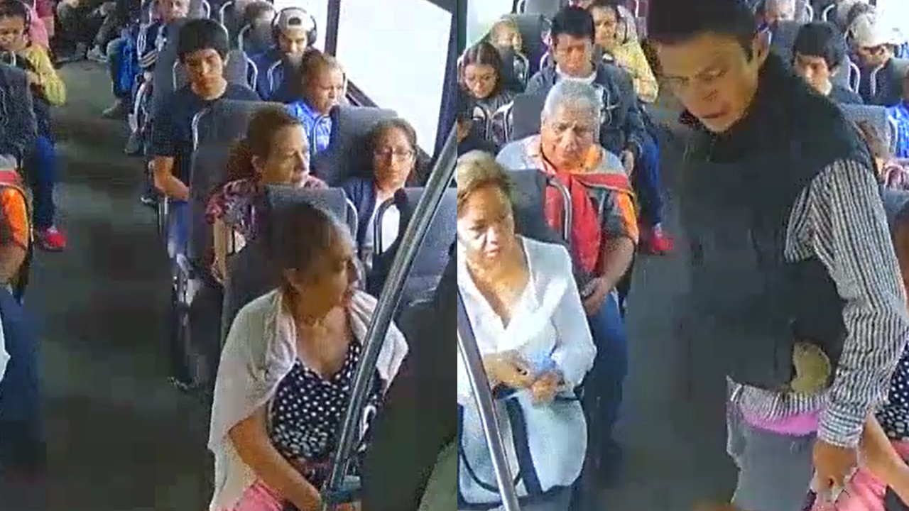 La cámara de seguridad de un bus registró el momento exacto en que dos hombres con cuchillo asaltan a los pasajeros de un bus.