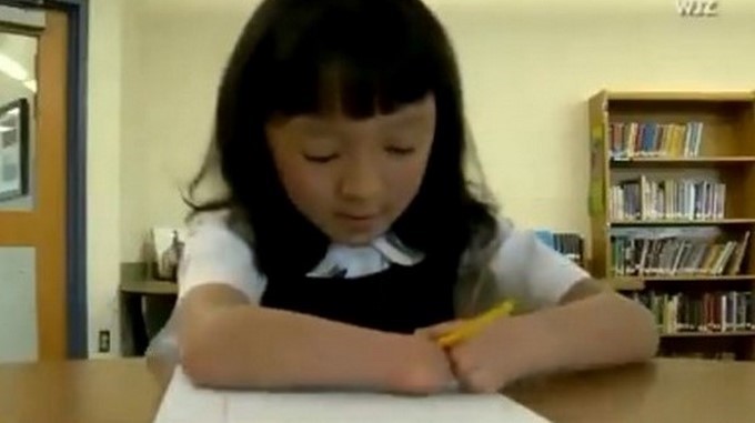 La pequeña sostiene el lápiz con las puntas de sus brazos para poder escribir. Dijo que cuando la profesora le enseñó a escribir en cursiva sintió que tenía un talento para eso.