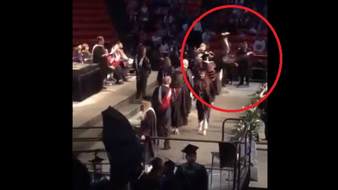 Un joven que estaba en plena graduación, quiso hacer algo inusual momento antes de recibir el diploma, dio una volteara hacia atrás que terminó mal en Texas, Estados Unidos.