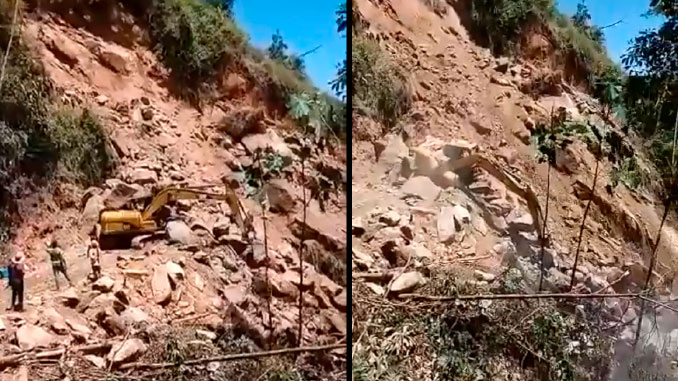 En el video registrado por los presentes se observa el momento exacto en el que la montaña cede y, de paso, arrastra la retroexcavadora con unas gigantescas piedras que logra llevarse en su camino, y momentos antes algunas personas estaban a pocos metros del incidente.