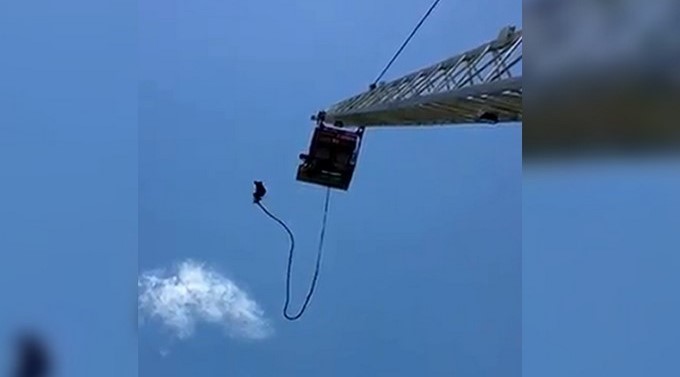 Luego de que el hombre saltara de la plataforma de aproximadamente 70 metros de altura, se escucha el momento en que una de las cuerdas se rompe y el hombre queda suspendido sobre el agua.