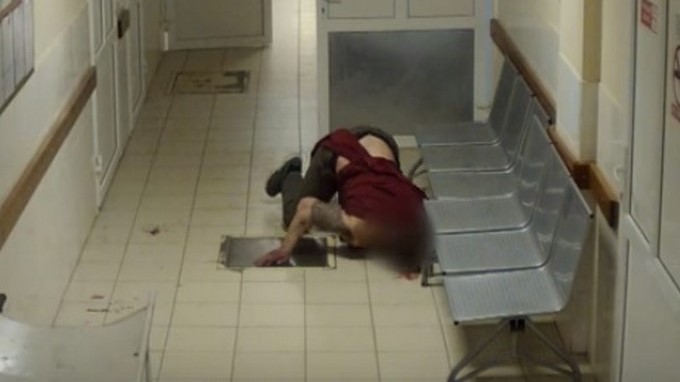 Según la grabación publicada por el medio RT el sujeto se observa en el suelo, al parecer en estado de embriaguez, cayendo varias veces en su cabeza, el personal del hospital pasa pero no lo ayudan.