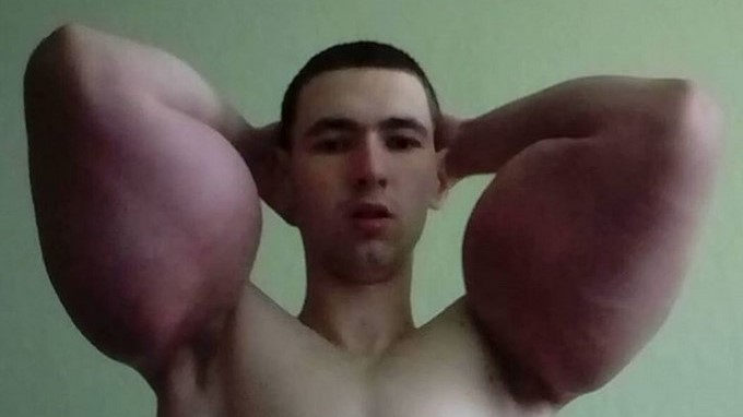 El hombre mostró con orgullo su cuerpo a través de las redes sociales, y para alcanzar un gran tamaño tenía que inyectarse litros de aceite en los brazos.