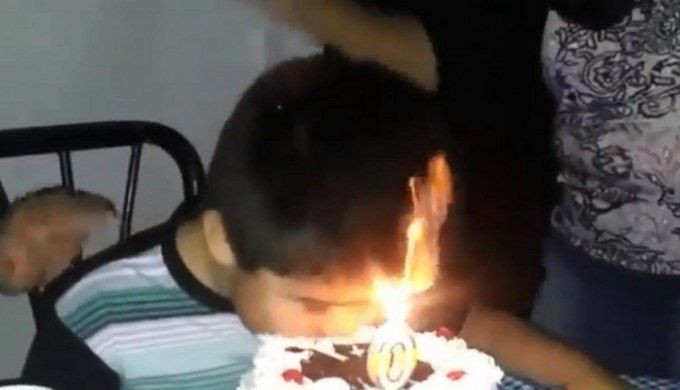Cuando le hunden la cabeza en el pastel se ve como el las llamas prenden parte de un mechón del pelo del niño y gracias a la pronta acción de una mujer que está cerca de él, el fuego no se extiende mucho.
