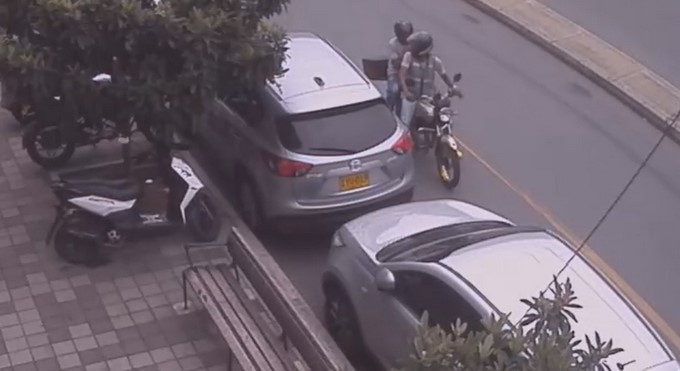 Los sujetos llegan “bien campantes” y mientras uno continúa a bordo de la moto, el otro se baja y arranca el espejo de los vehículos que están estacionados al costado de la calle.