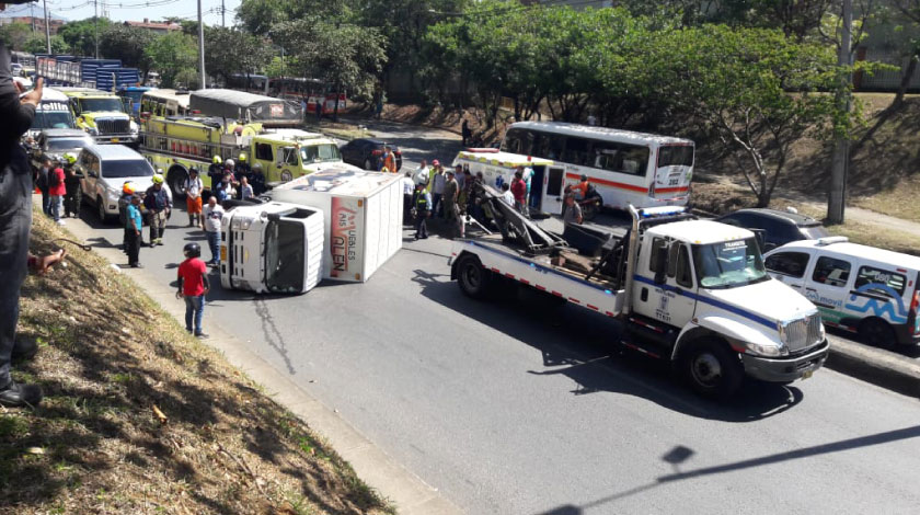 Por el momento se desconoce cómo se presentó el hechos en el que un camión terminó volcado en plena vía, a la altura del Parque Juanes, en sentido Norte-Sur.