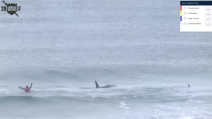 Las aletas de dos ballenas asesinas sobresalían a pocos metros de la arena y muy cerca de los competidores que veían con incredulidad como las orcas los rodeaban.