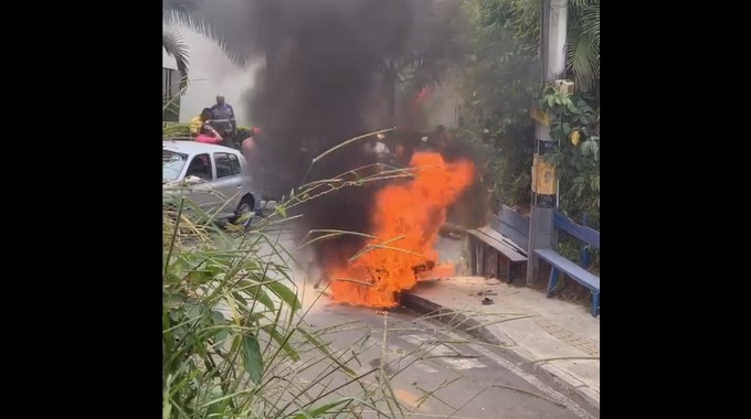 EN VIDEO: ¡Tremendo accidente! En llamas quedó una moto tras impactar con un carro en la Loma del Chocho