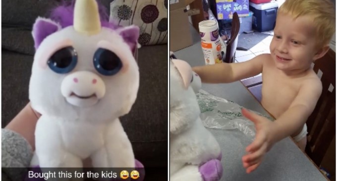 EN VIDEO: Tremendo susto se llevó este pequeño con un unicornio de peluche