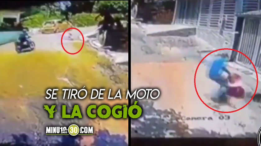 El hombre, sin pensarlo dos veces y en instantes, se lanza de su moto y sale corriendo tras la bebé, la cual alcanza a coger. Momentos después aparece una mujer corriendo tras la niña.