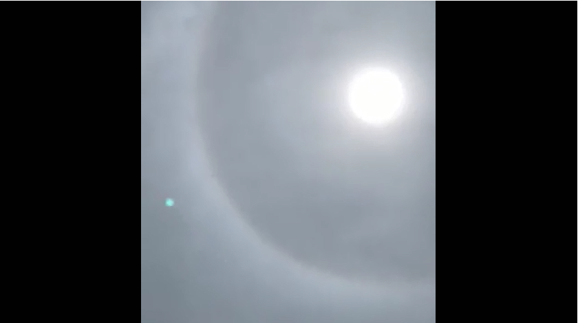 Se trata de un halo solar, el cual se produce cuando nubes altas, conformadas por cristales de hielo permiten que se vea el sol a través de la refracción de luz de estos cristales.