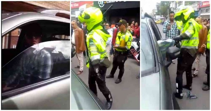 El conductor sube el vidrio del vehículo y de un momento a otro se baja de este y en su reemplazo ingresa una mujer que de arranca el carro, ignorando por completo las peticiones del Policía.