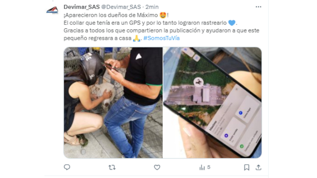 De acuerdo con la Concesionaria Desarrollo Vial al Mar – Devimar – el perrito “Es macho, no está castrado, no es agresivo y tiene collar negro con un chip, pero sin número”.