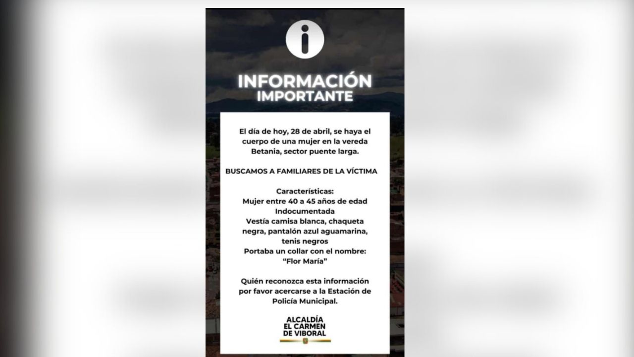 La Alcaldía de El Carmen de Viboral hace un llamado a familiares o conocidos de la víctima para que se acerquen a la Estación de Policía Municipal y puedan colaborar en la identificación de la mujer fallecida.