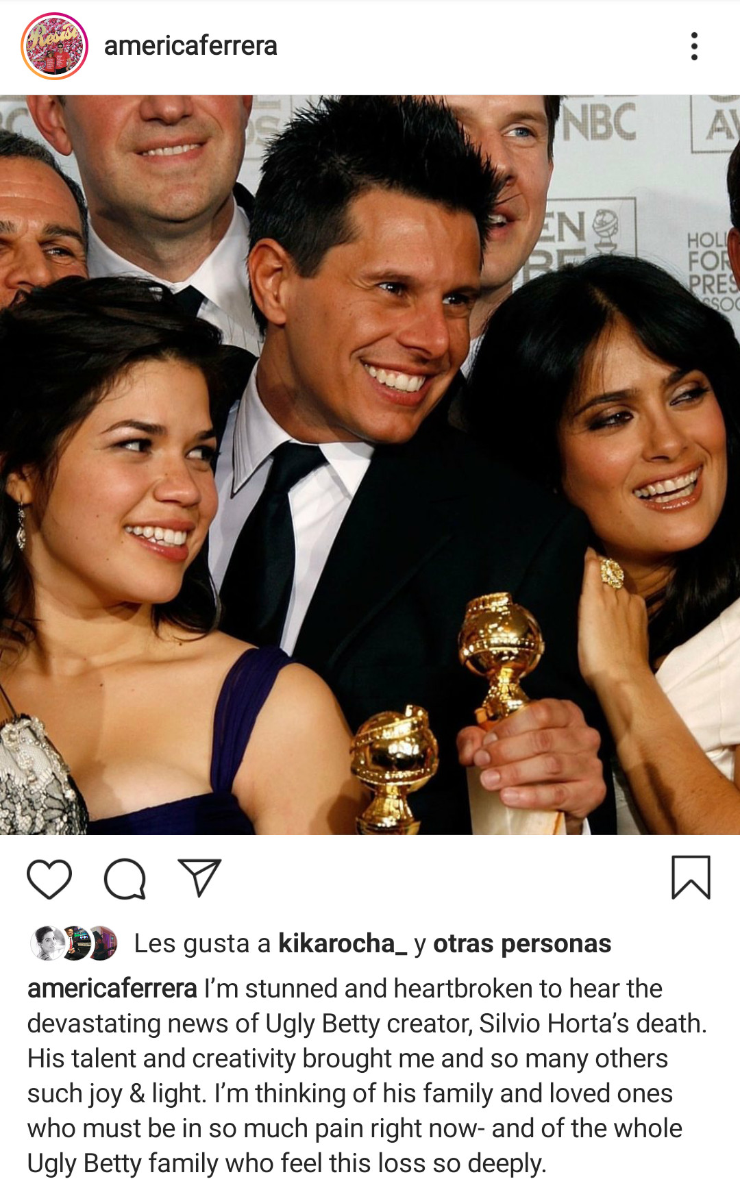 “Estoy impactada y con el corazón partido al escuchar la devastadora noticia de la muerte del creador de ‘Ugly Betty’, Silvio Horta… Su talento y creatividad me trajo a mí y a muchos otros mucha alegría y luz”, escribió América Ferrera, ganadora del Globo de oro por su rol protagónico en esta serie, producida por Salma Hayek.