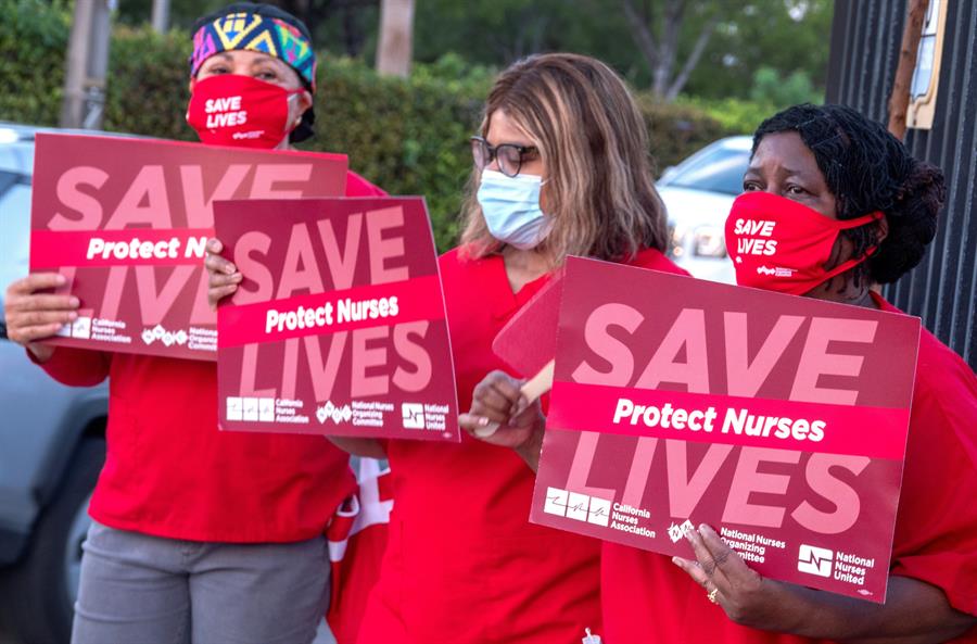 Eddy Cruz, vicepresidente de National Nurses Union (NNU), convocante de la protesta, pidió a las autoridades sanitarias “transparencia” sobre los casos de COVID-19 entre los trabajadores y “comunicación”