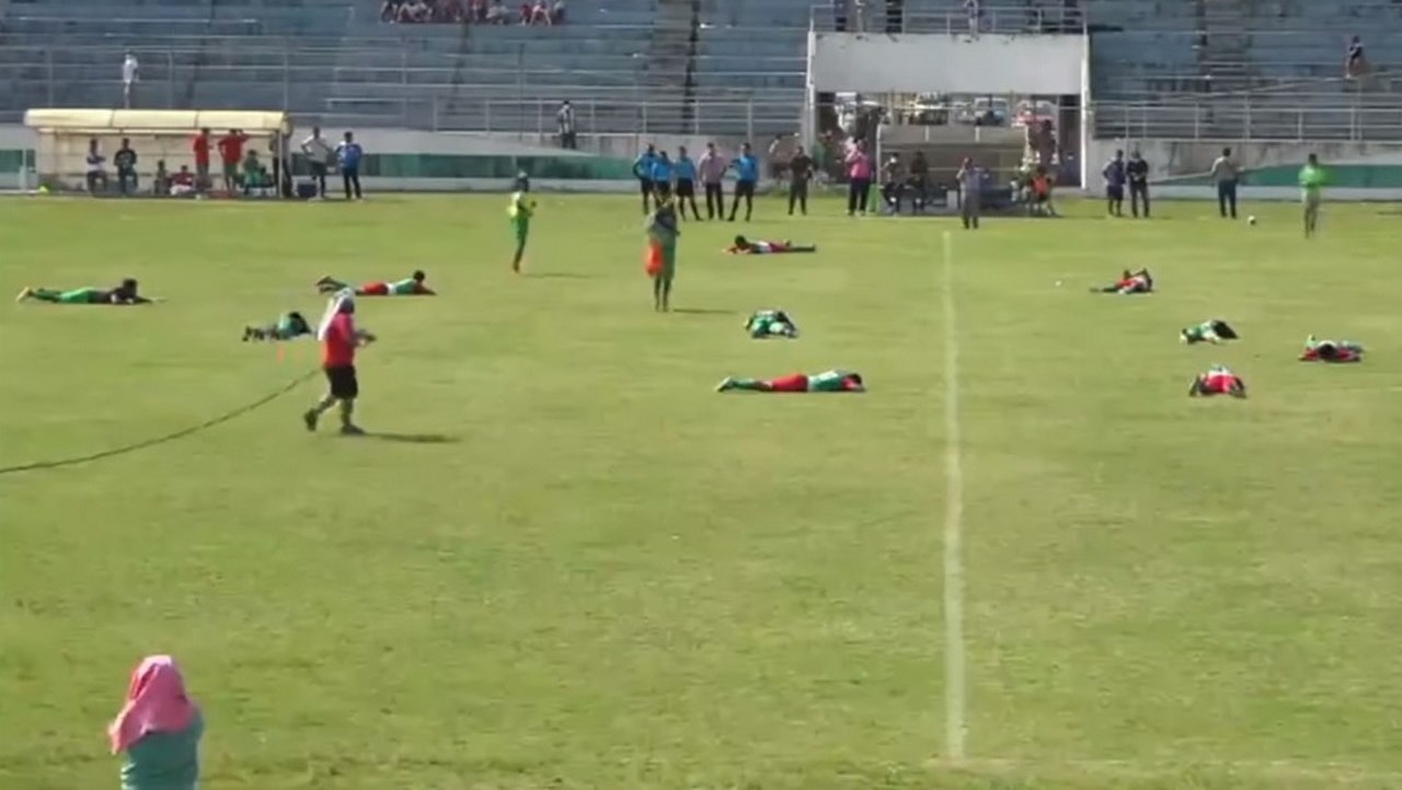 En video quedó el momento en que los futbolista se tiraron al piso para evitar picaduras de las abejas, que interrumpieron el partido entre Atlético Warnes y Municipal Pailón en el estadio Edgar Peña Gutiérrez en la ciudad de Warnes, Bolivia.