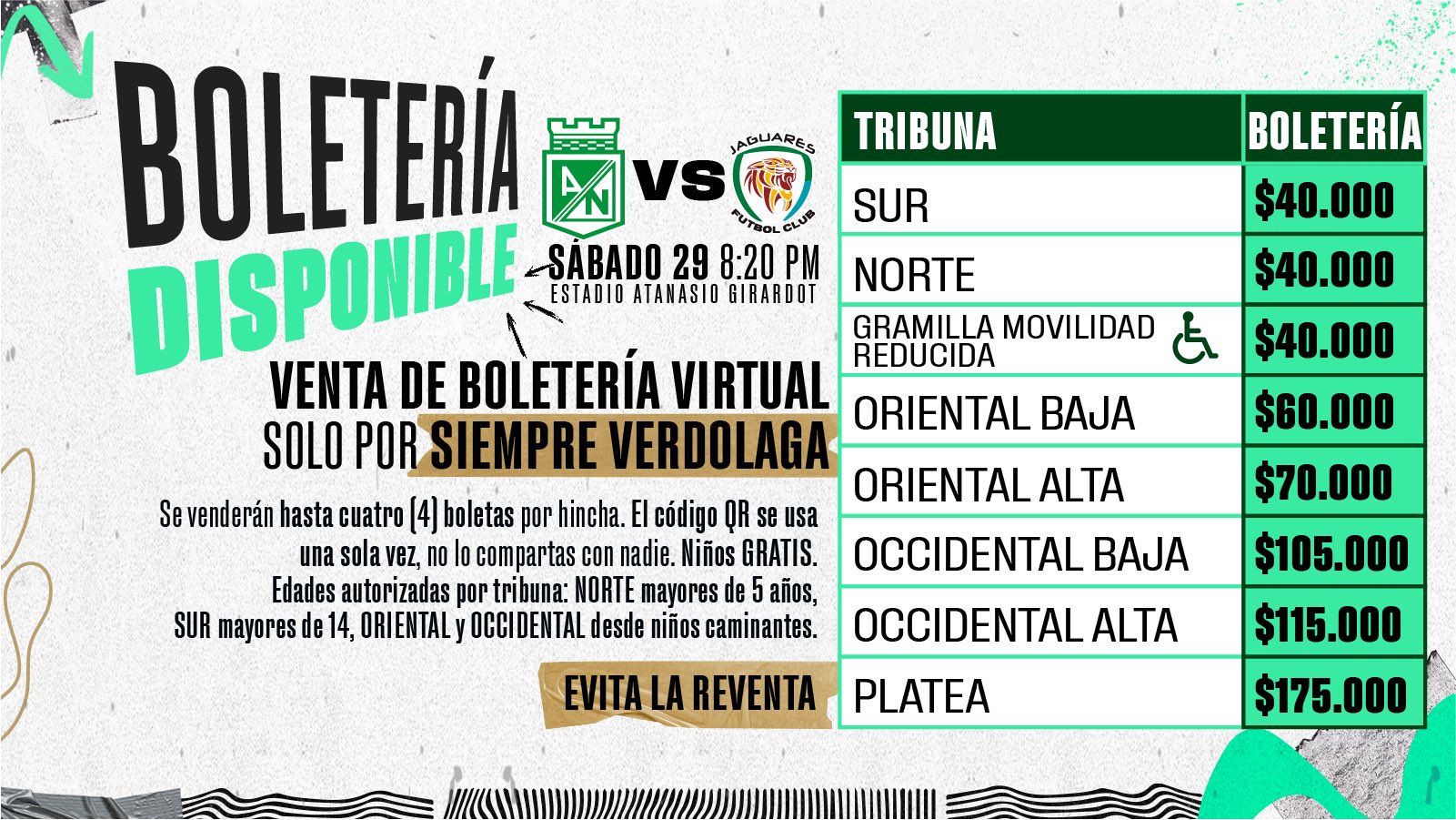 Atlético Nacional anunció la venta de boletas para el partido de este sábado 29 de julio en el que recibirá a Jaguares de Montería.