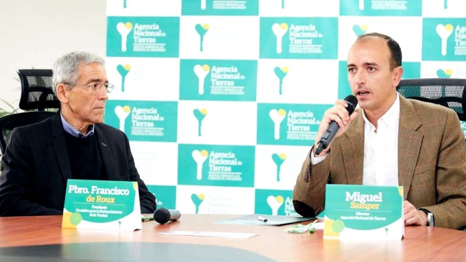 Fotografía cedida por la oficina de prensa de la Agencia Nacional de Tierras en la que se observa al presidente de la Comisión de la Verdad, Francisco de Roux (i), y al director de la Agencia Nacional de Tierras, Miguel Samper, hoy, miércoles 1 de agosto de 2018, en Bogotá (Colombia). EFE/AGENCIA NACIONAL DE TIERRAS