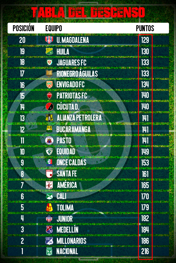 Por su parte, Atlético Huila logró un empate en su visita al Independiente Santa Fe, pero dada su necesidad, este resultado no se ve reflejado en el escalafón, en el que se ubica penúltimo con 130 unidades.