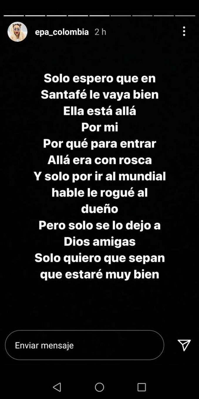 “Solo espero que le vaya bien en Santa Fe. Ella está en Santa Fe por mí, porque para ir allá se necesita rosca. Está allá solo porque fui al Mundial y le rogué al dueño”, expresó Daneidy Barrera, nombre real de la influecer.