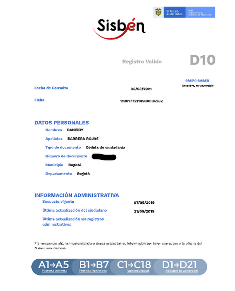 Muchos colombianos podrían imaginarse que la mujer pordría beneficisiarse de subsidios del Gobierno solo por pertenecer a esta clasificación pero no es así; según el documento, Barrera pertecene a la clasificación D10, lo que significa que hace parte de la población “no pobre, no vulnerable” del país.