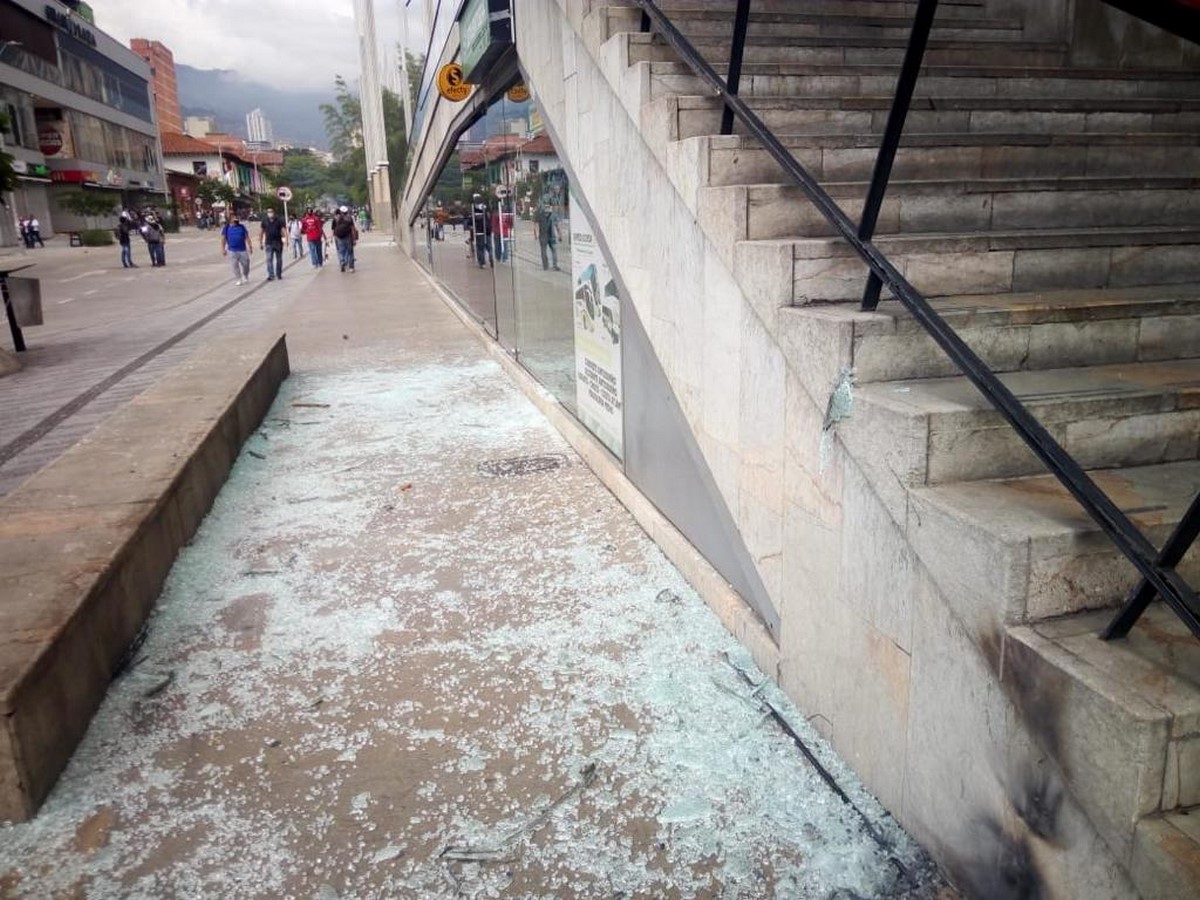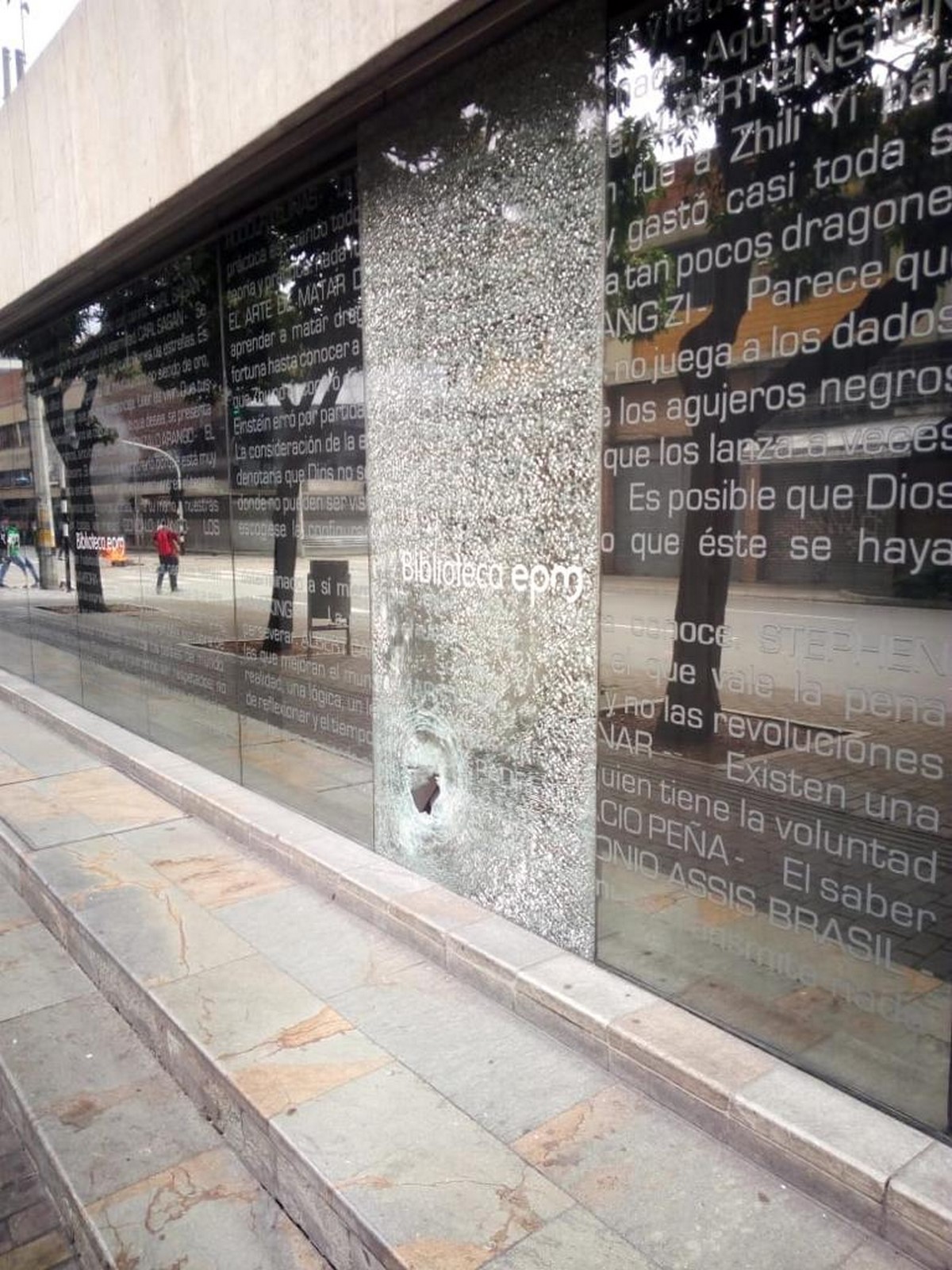 En los actos de vandalismo se vio afectada la Biblioteca EPM, en el sector de La Alpujarra, con la rotura de vidrios de la pasarela de ingreso, en los pasillos de acceso al sótano y en una sede bancaria; paredes y fachadas rayadas, desinstalación de la placa inaugural, y averías a la galería de arte en el Parque de las Luces.