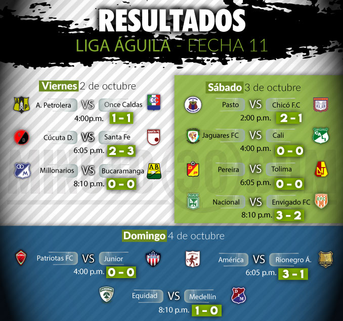 Independiente Santa Fe se impuso (2-3) en su visita a Cúcuta Deportivo; Deportivo Cali se trajo un empate (0-0) de Montería frente a Alianza Petrolera; Atlético Nacional derrotó (3-2) a Envigado en el Atanasio Girardot; Atlético Junior arañó un punto de visitante ante Patriotas (0-0) y América de Cali superó (3-1) a Águilas Doradas.
