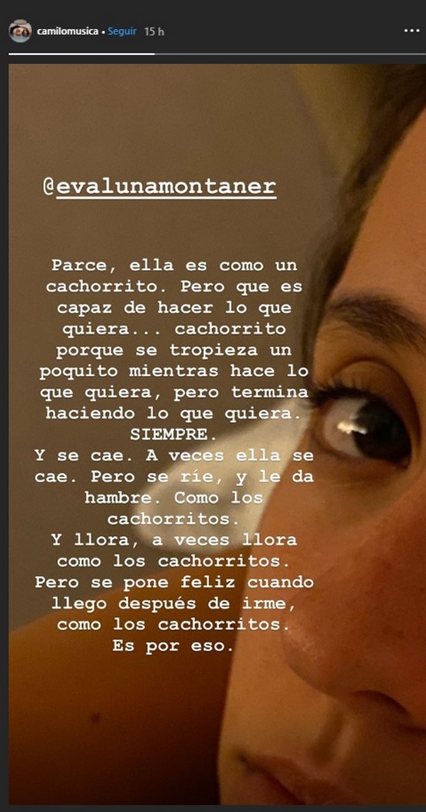 “Parce, ella es como un cachorrito. Pero que es capaz de hacer lo que quiera”, inició diciendo Camilo en una fotografía donde se veía la mitad del rostro de Evaluna y letras de color blanco encima.