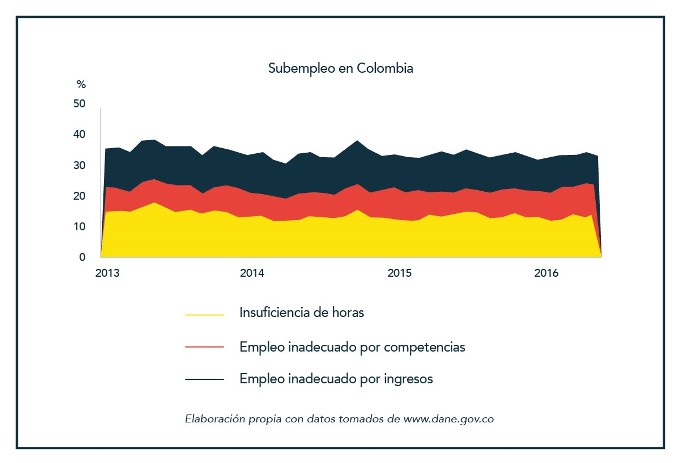 Para el caso colombiano, el Departamento Nacional de Estadística (DANE), ha definido que el subempleo en el país se divide en dos vertientes: la primera es el subempleo objetivo, que se refiere a aquellas personas que manifestaron su inconformidad e hicieron algo en la semana de referencia para cambiar de empleo; y, la segunda vertiente, es el subempleo subjetivo, en la cual, aunque las personas manifestaron su inconformidad, no han realizado ninguna acción para mejorar su situación.