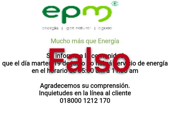 Por su parte, Empresas Públicas de Medellín aclaró en su cuenta de Twitter que la cadena en redes sociales no es cierta, así mismo compartió el enlace para consulta de las suspensiones programadas en Antioquia.